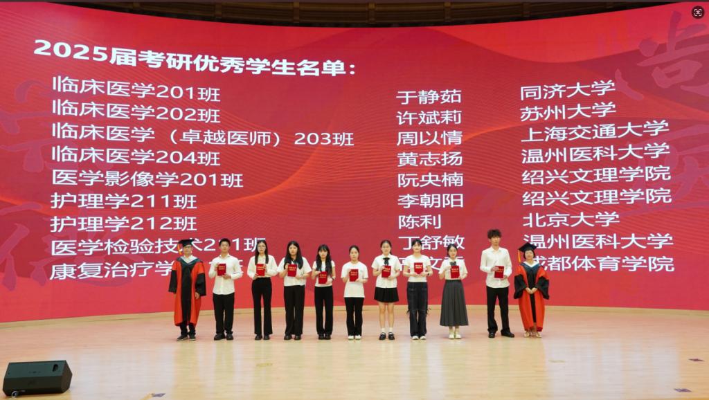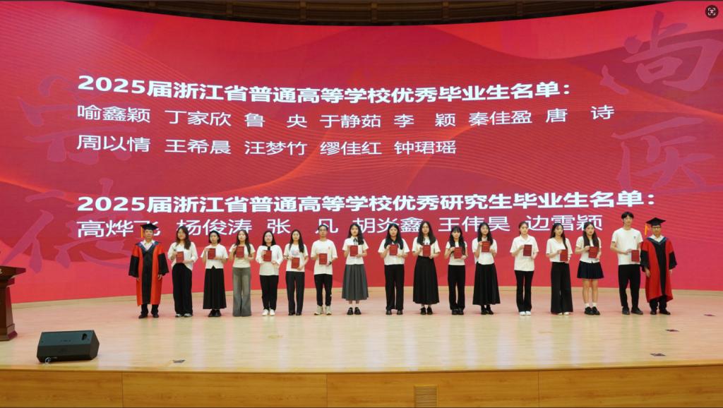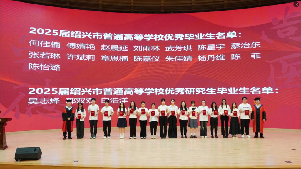 吴剑平、方兴亮为2025届浙江省优秀毕业生代表颁奖,鲁葆春、林国旗为2025届绍兴市优秀毕业生代表颁奖,傅永平、徐永根为2025届校级优秀学生干部代表、2025届校级优秀毕业生代表颁奖,陈国华、王建英为2025届院级优秀学生干部代表、2025届院级优秀毕业生代表颁奖,杨国军、孙一勤为2025届院级考研优秀学生代表颁奖。杨国军为2025届毕业生校友联络员颁发聘书。