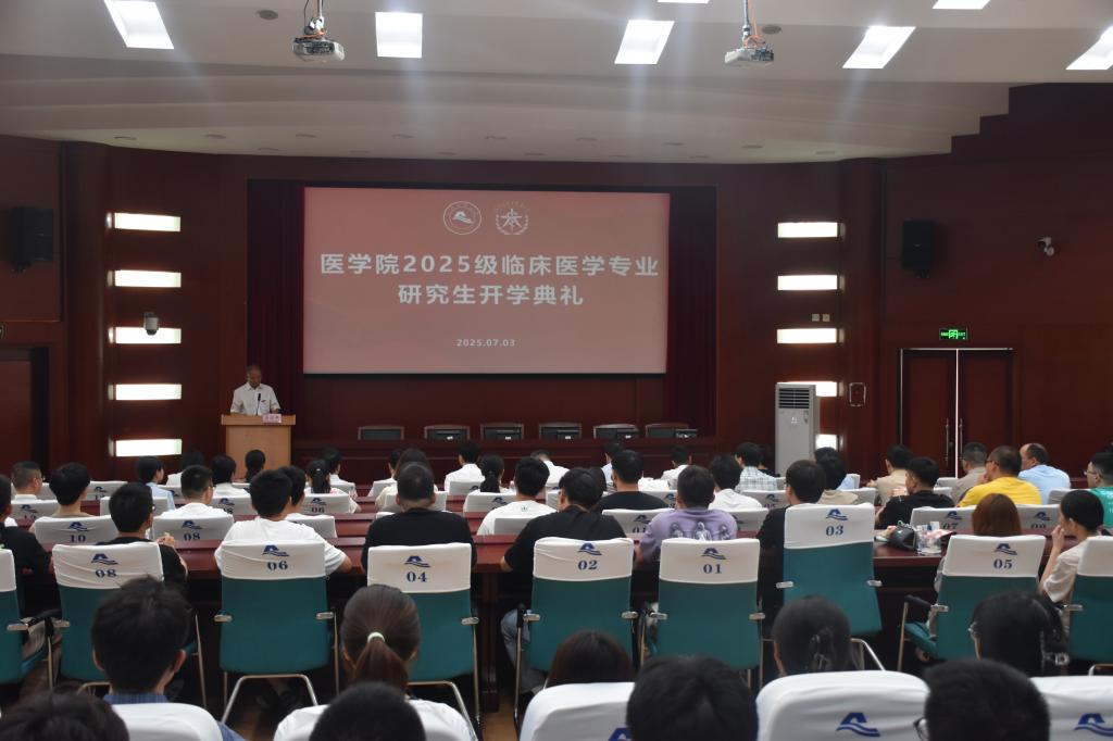 柳国庆讲话。他对2025级临床医学专业研究生表示祝贺和欢迎。他指出,绍医人要积极回应国家重大战略需求和人民生命健康的呼声,秉持“修德求真”的校训和“崇德尚医”的院训,保持务实勤奋“向上攀”的执着,勇闯“无人区”的胆识和“甘坐十年冷板凳”的定力,将自身的发展与“健康中国2030”战略蓝图和人民群众的健康福祉紧密相连。他勉励同学能够恪守仁心,筑牢职业根基,树立仁爱之心,遵守职业伦理,坚持学术规范,要精研医术,锤炼核心能力,牢固掌握基础理论、基本知识和基本技能,锤炼批判性临床思维,要精勤治学,融合临床科研,将科研的严谨性融入临床实践,用科学的方法提升临床决策水平。