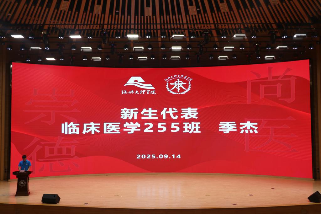 教师代表彭海生教授,新生代表、临床医学255班季杰同学分别发言。