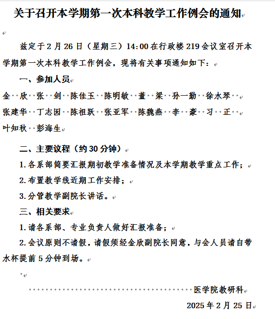 关于召开本学期第一次本科教学工作例会的通知