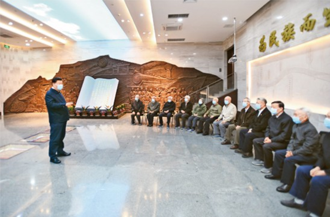2020年4月20日至23日,中共中央总书记、国家主席、中央军委主席习近平在陕西考察。这是4月22日,习近平在西安交通大学交大西迁博物馆亲切会见西迁老教授。 新华社记者 谢环驰/摄
