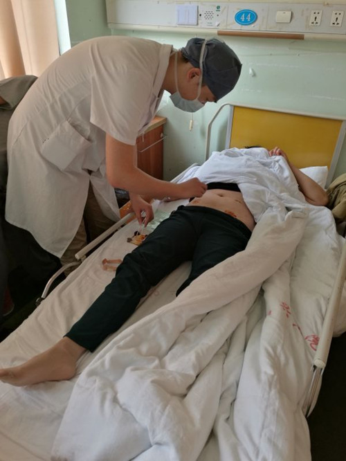 随后,我们全副武装,碘酒、棉球、敷贴、镊子、一次性碗准备完毕,核对好病人信息后给予换药。偶尔来了新病人,便要停下手中的活去迎接,包括采集病史、医嘱录入、完善体格检查和专科检查,总而言之,就是全身心的投入到为病人服务中去。在走廊上时不时地可以看到我们穿梭在每个病房的匆忙身影。